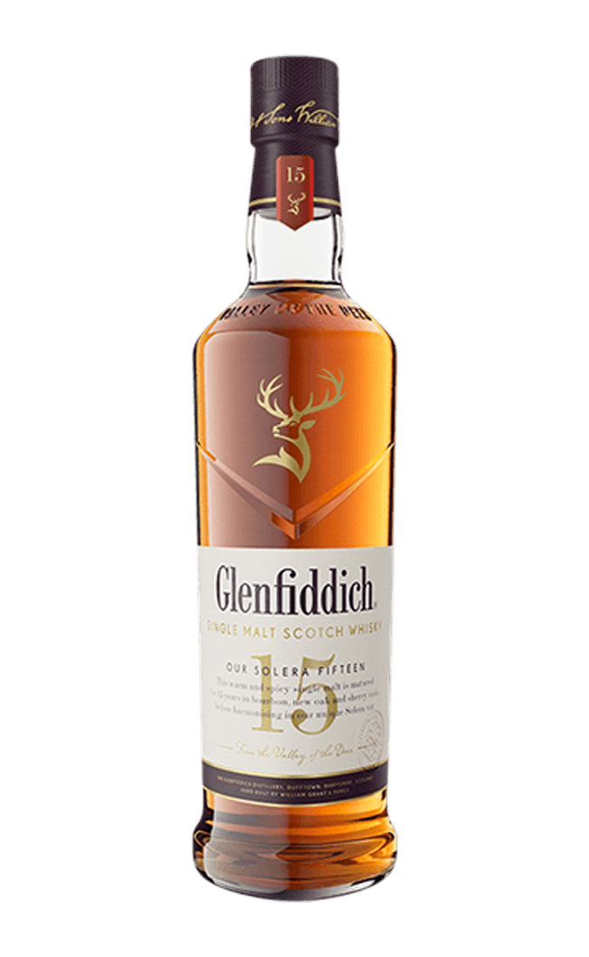 A 15-year-old single malt Scotch from Glenfiddich Distillery, made up of whiskies matured in American bourbon, sherry, and virgin oak. Inspired by the classic sherry-making bodegas of Spain and Portugal, the 15-year-old whiskies are left to mellow and intensify in a solera vat, a large oak vat that hasn't been emptied since 1998.